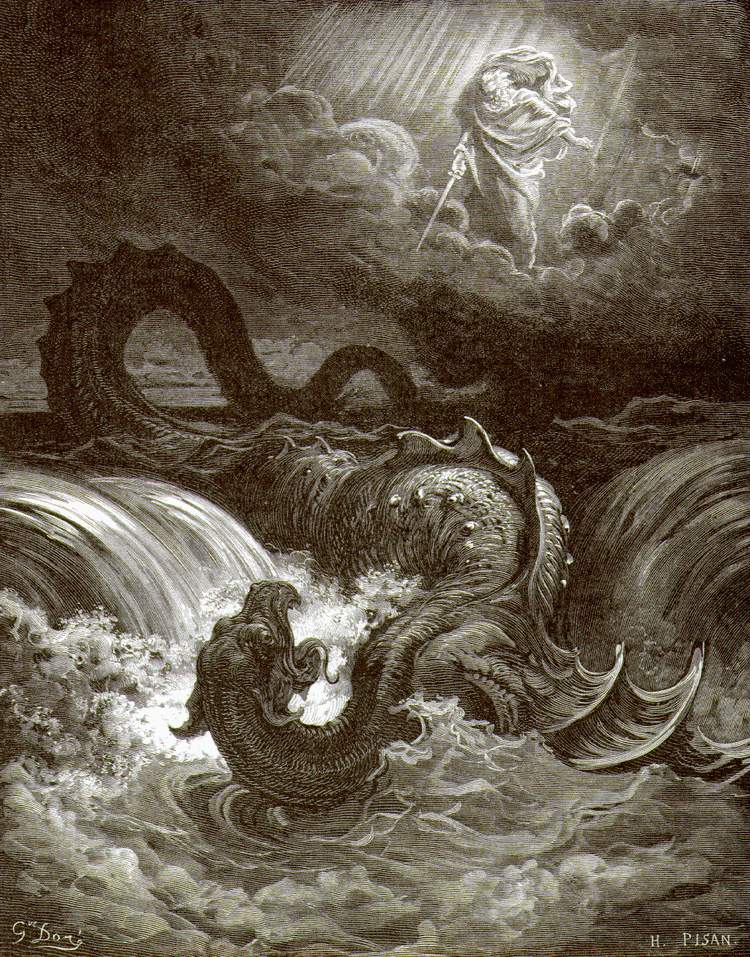 "В тот день поразит Господь мечом Своим тяжелым, и большим и крепким, левиафана, змея прямо бегущего, и левиафана, змея изгибающегося, и убьет чудовище морское"