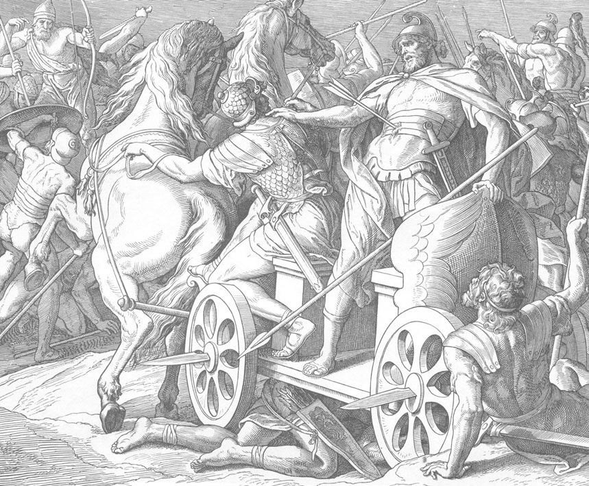 Но сражение в тот день усилилось, и царь стоял на колеснице против Сириян, и вечером умер, и кровь из раны лилась в колесницу.