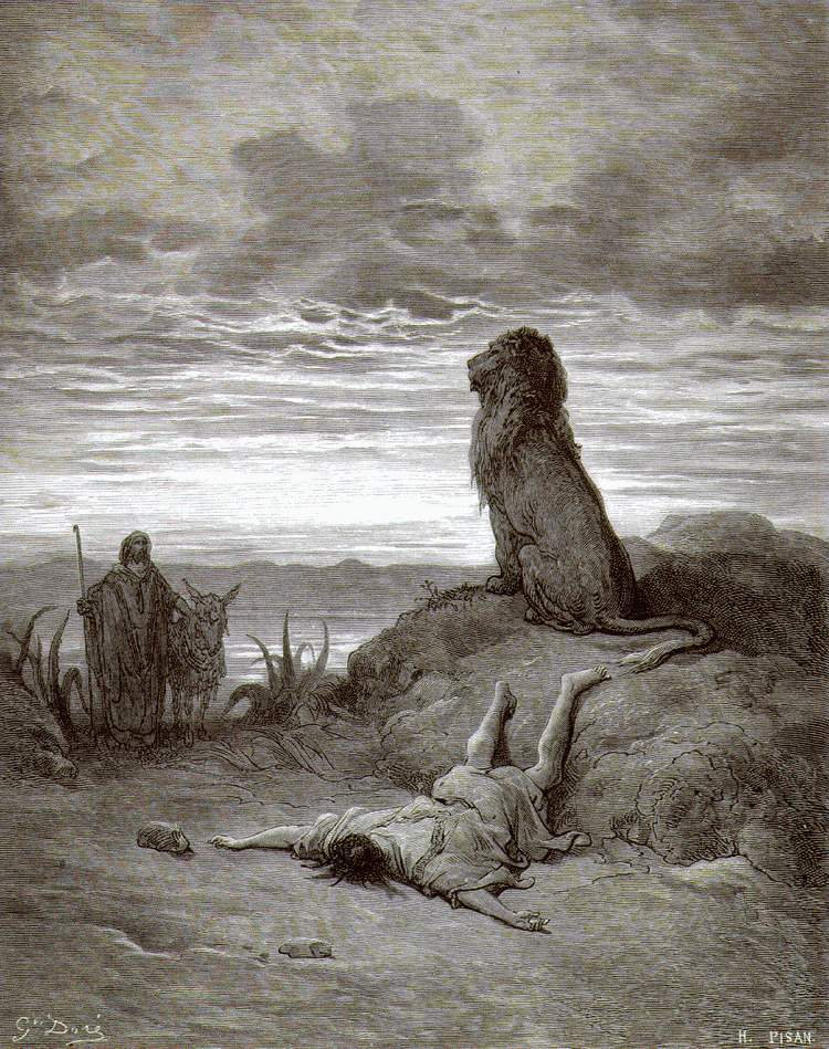 И отправился тот. И встретил его на дороге лев и умертвил его. И лежало тело его, брошенное на дороге; осел же стоял подле него, и лев стоял подле тела.