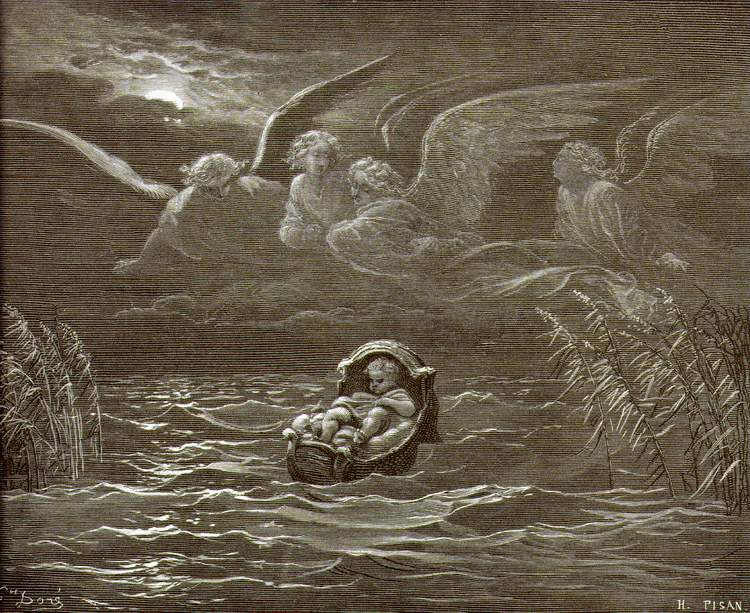 Жена зачала и родила сына и, видя, что он очень красив, скрывала его три месяца; но не могши долее скрывать его, взяла корзинку из тростника и осмолила ее асфальтом и смолою и, положив в нее младенца, поставила в тростнике у берега реки, а сестра его стала вдали наблюдать, что с ним будет."