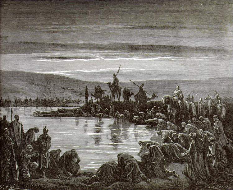 Он привел народ к воде. И сказал Господь Гедеону: кто будет лакать воду языком своим, как лакает пес, того ставь особо, также и тех всех, которые будут наклоняться на колени свои и пить.