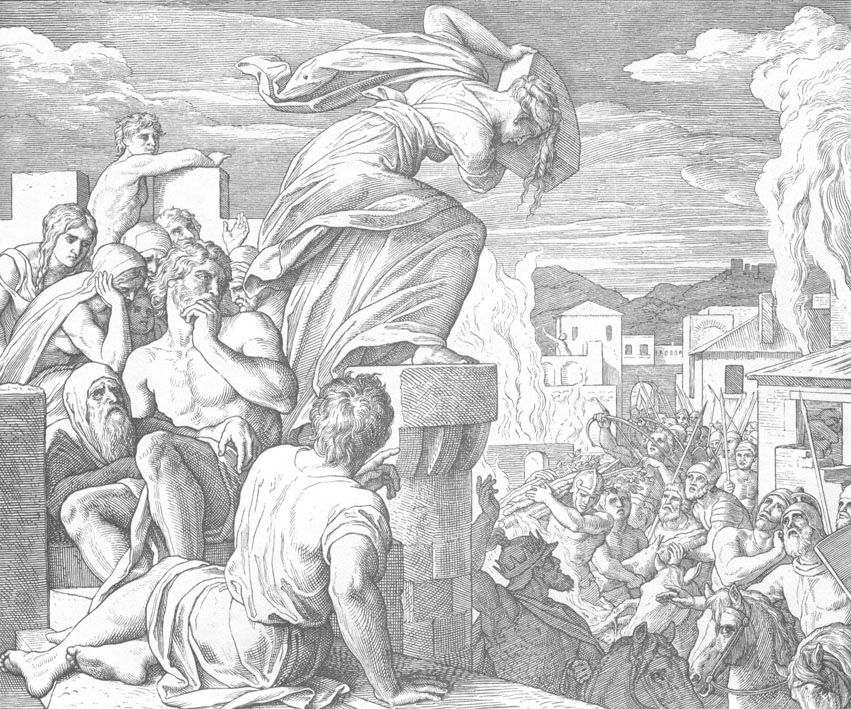 Среди города была крепкая башня, и убежали туда все мужчины и женщины и все жители города, и заперлись и взошли на кровлю башни.